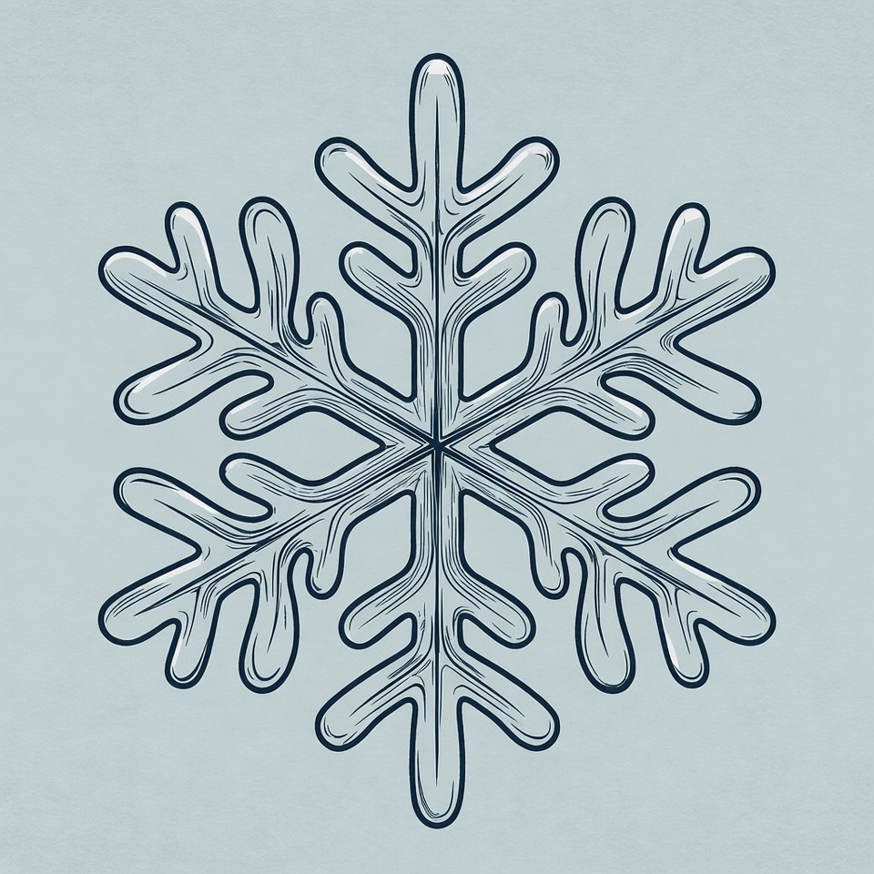 A detailed line art illustration of a snowflake with symmetrical branches and intricate patterns. The snowflake is centered on a light blue background, outlined in dark blue lines. It features pointed arms extending outward in a classic hexagonal shape.