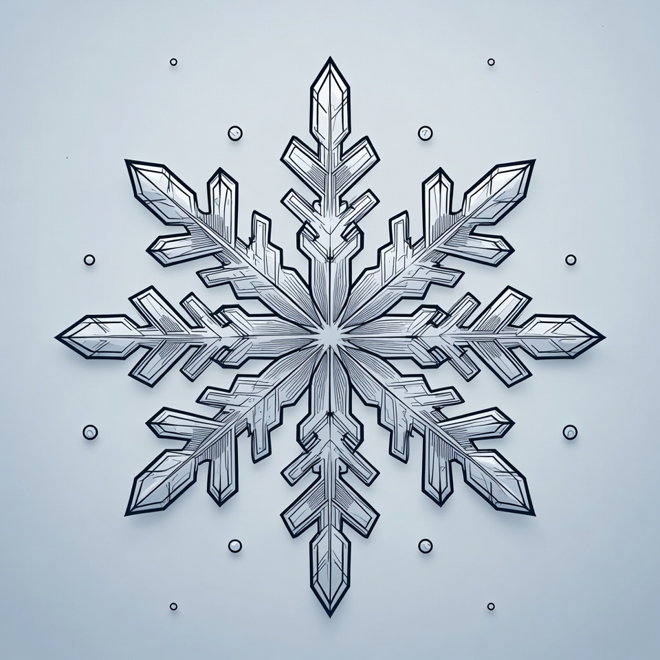 A large intricate snowflake is illustrated with sharp geometric lines and symmetrical branches on a light blue background. Smaller snowflake dots surround it, emphasizing a winter theme. The design features crisp white outlines and subtle shading for depth.