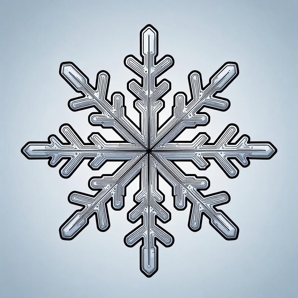 A detailed snowflake illustration features symmetrical branches with intricate patterns. It has a metallic silver appearance outlined in black against a light blue gradient background. The design is isolated and centered perfectly.