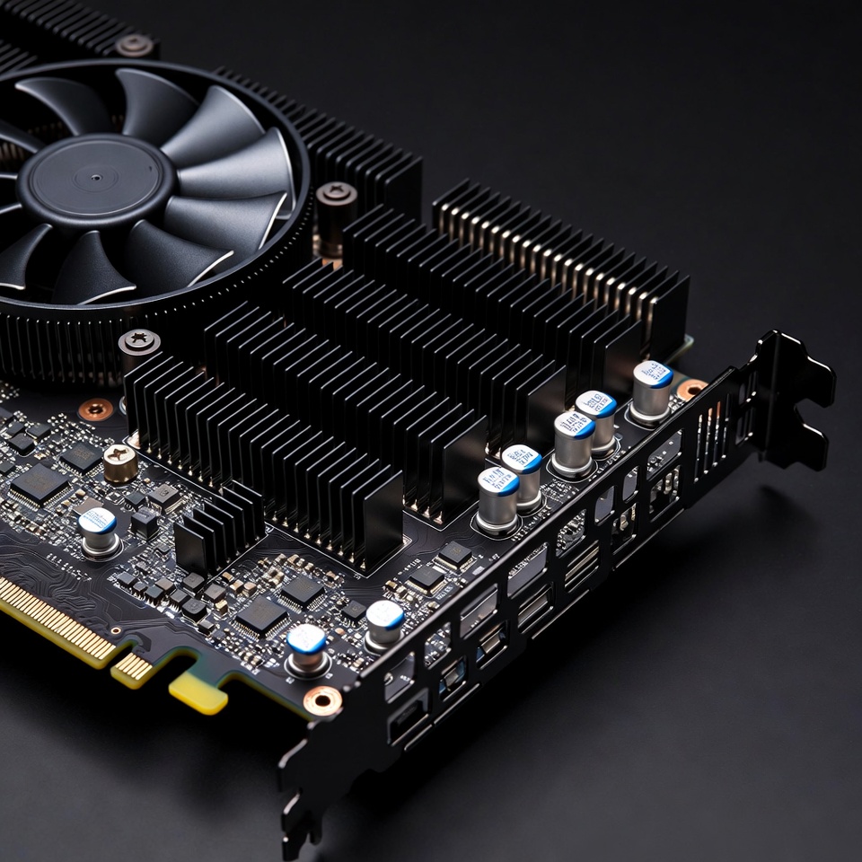 GPU, NVIDIA, PCB board, PCIe connector, black GPU, capacitors, circuit board, computer hardware, cooling fan, electronics, fan blades, gaming GPU, heatsink fins, high-end graphics, isolated background, tech component, video card, graphics card