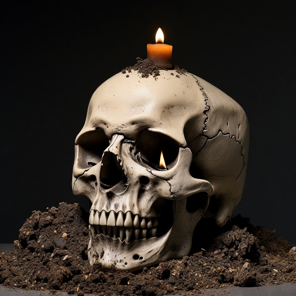 A realistic human skull sits in a pile of dark soil on a gray surface. An orange lit candle is placed on top of the skull's dome. The skull features detailed teeth and eye sockets with subtle light reflections.