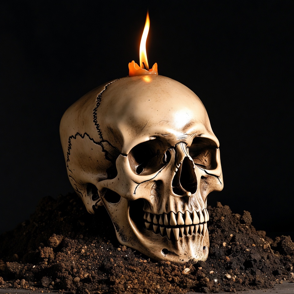 A realistic human skull sits on a pile of dark dirt with a lit orange candle burning on top of its cranium. The flame flickers brightly against the black background. The skull features detailed bone structure, hollow eye sockets, and grinning teeth.