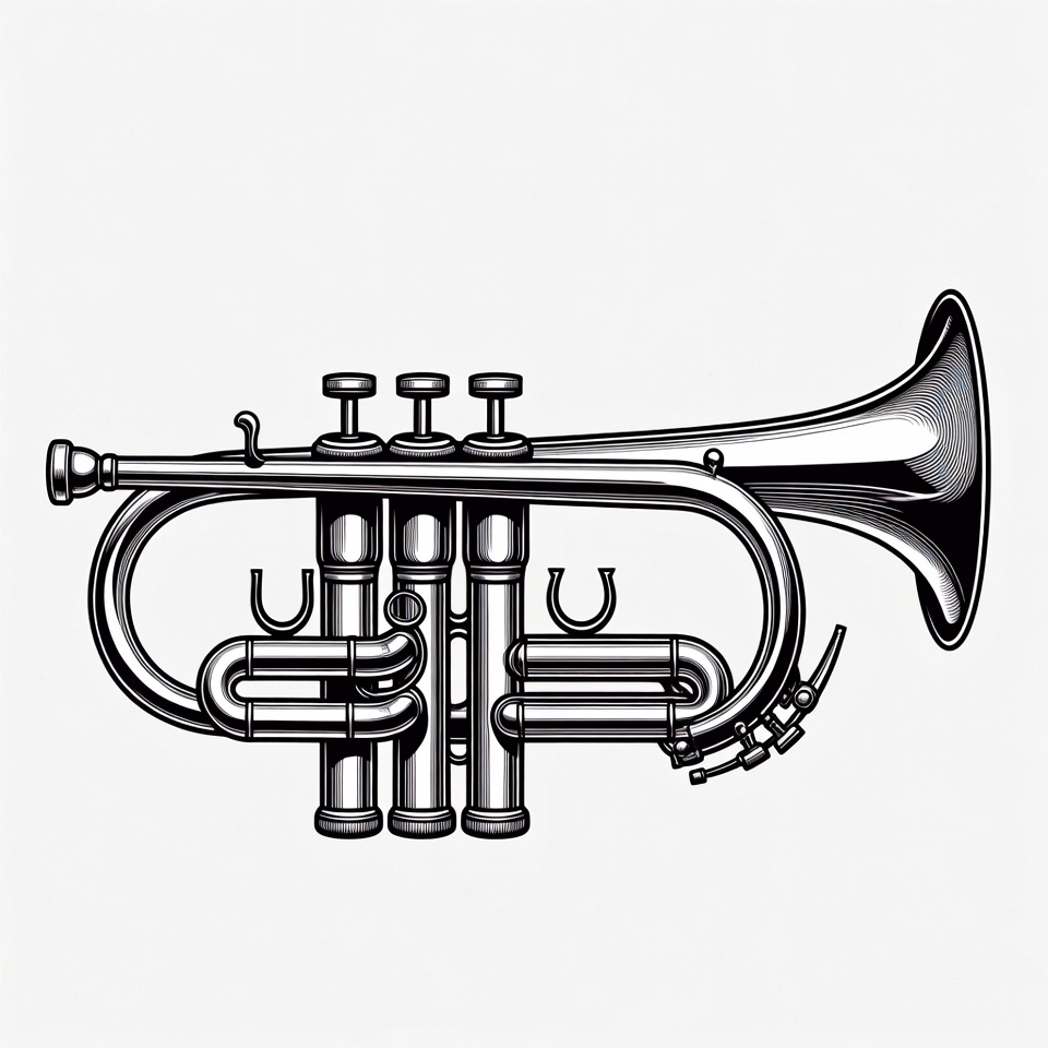 black and white, brass instrument, clipart, curved tubing, detailed drawing, flared bell, illustration, isolated background, line art, musical instrument, shiny trumpet, trumpet valves, vector, trumpet