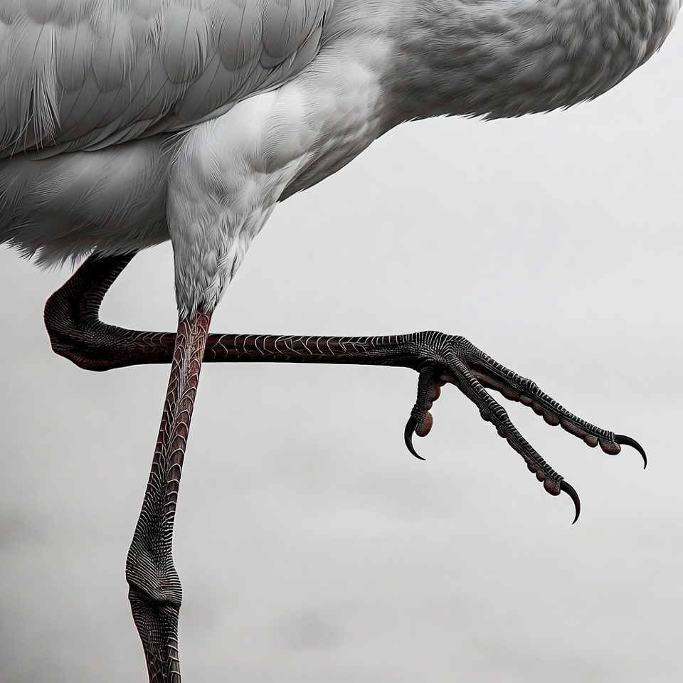A great egret stands with its long red legs prominently displayed against a white background. The bird's white feathers cover its body, while its thin black legs end in sharp talons. The image focuses closely on the legs and feet.