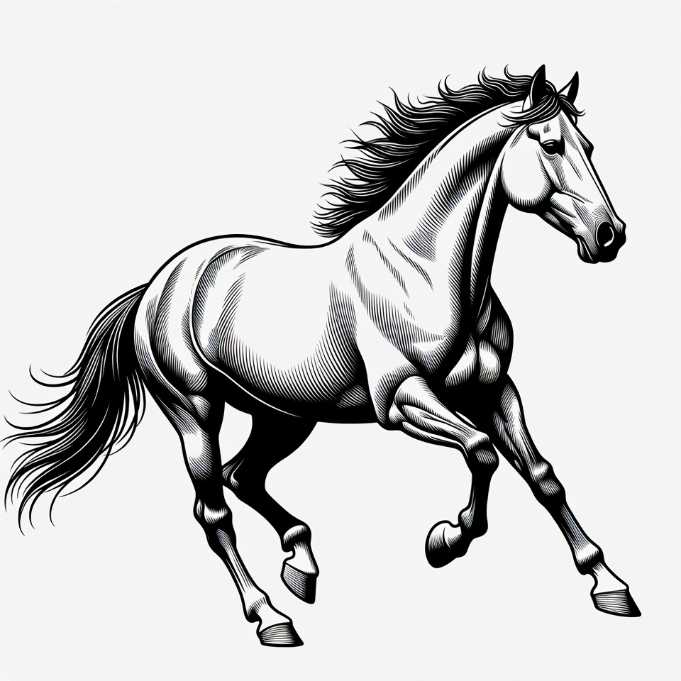 animal, black and white, clipart, engraving style, equine, flowing mane, galloping horse, horse illustration, horse tail, isolated background, line art, running horse, stallion, vector art, horse