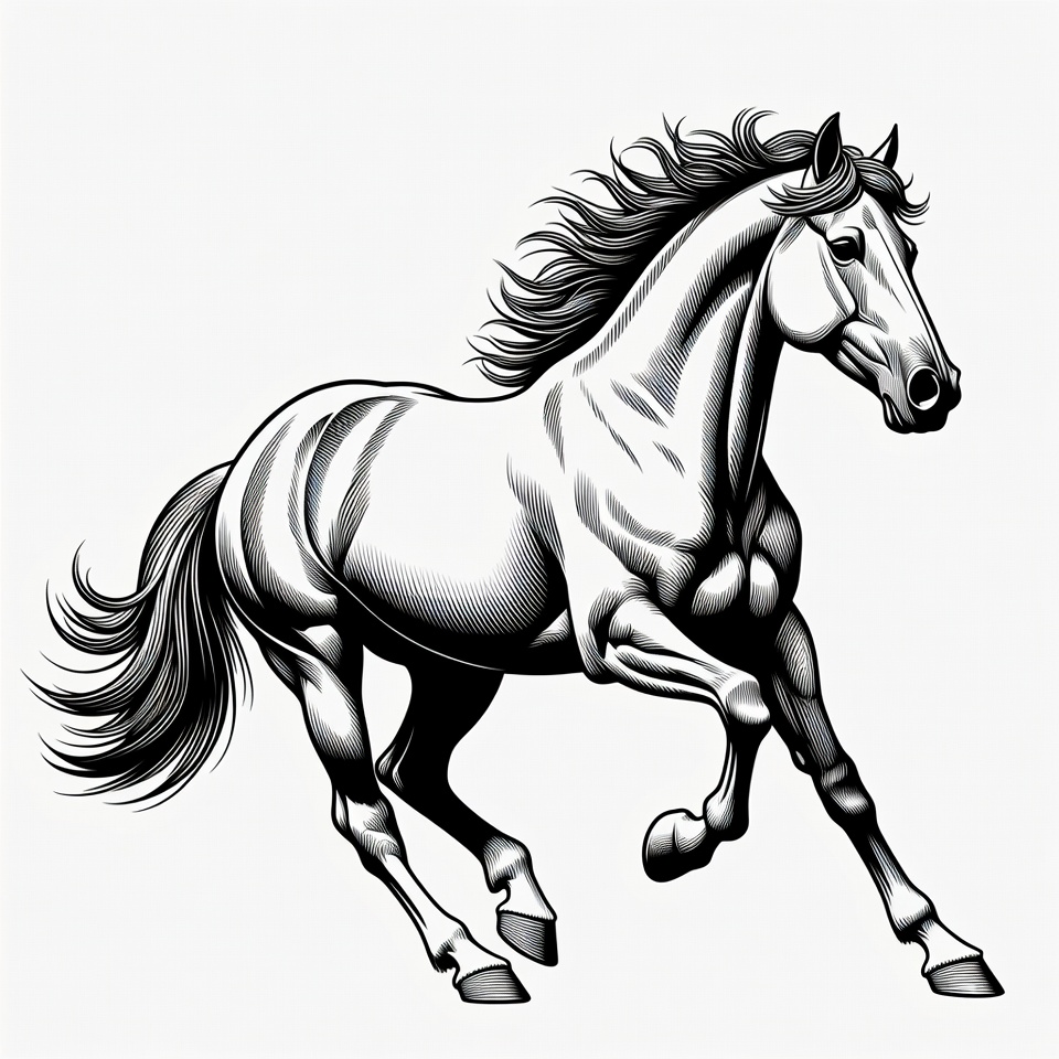 A detailed black and white line art illustration of a majestic horse galloping dynamically. The horse has a flowing mane and tail, with muscular legs extended in motion. It is depicted on an isolated white background.