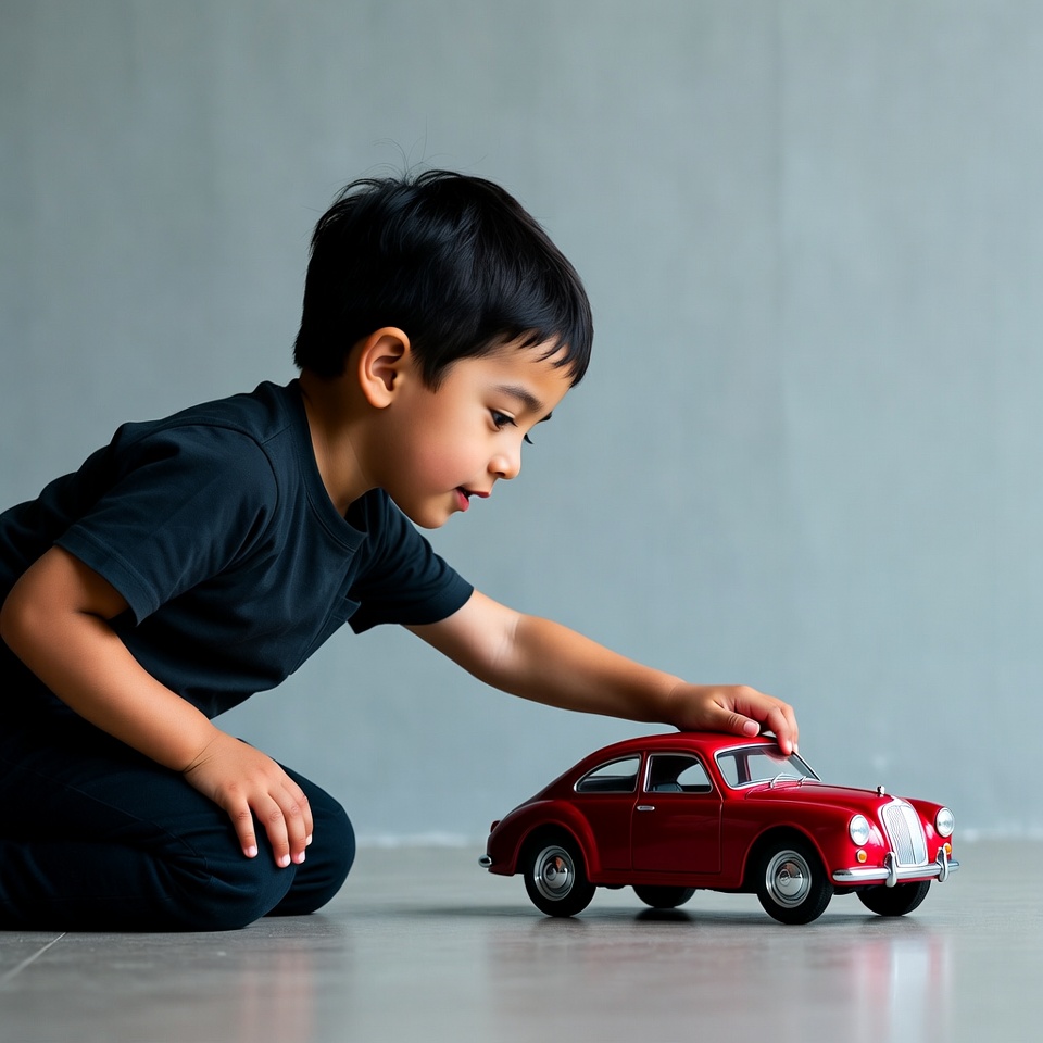 A young Asian boy with short black hair kneels on the floor, reaching out to touch a red toy car. He wears a black t-shirt and shorts, with a focused expression on his face. The scene is set against a plain gray background.