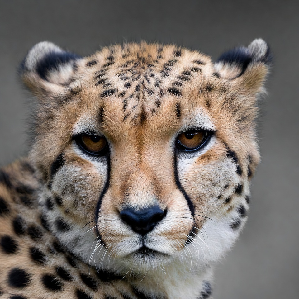 A cheetah stares directly at the camera with intense yellow eyes and black tear markings. Its head features distinctive tan fur covered in black spots, with small rounded ears and a black nose. The animal is isolated against a plain gray background.