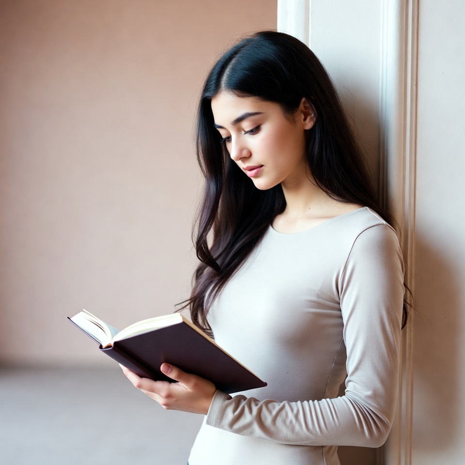 A young woman with long dark hair leans against a white wall while reading an open brown book. She wears a light gray long-sleeve top and gazes down at the pages intently. The background features soft beige tones and an ornate door frame.