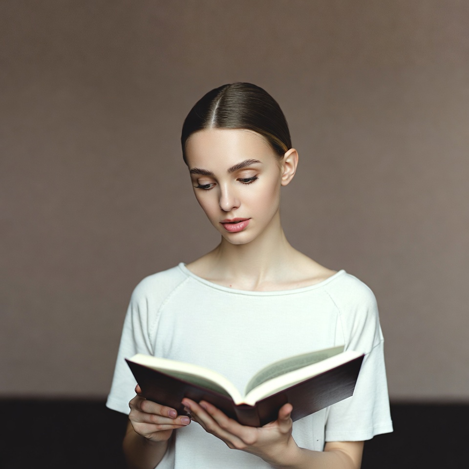 A young woman with brown hair in a ponytail intently reads an open book held in her hands. She wears a white off-shoulder top and stands against a beige background. Her focused expression highlights her slender neck and face.