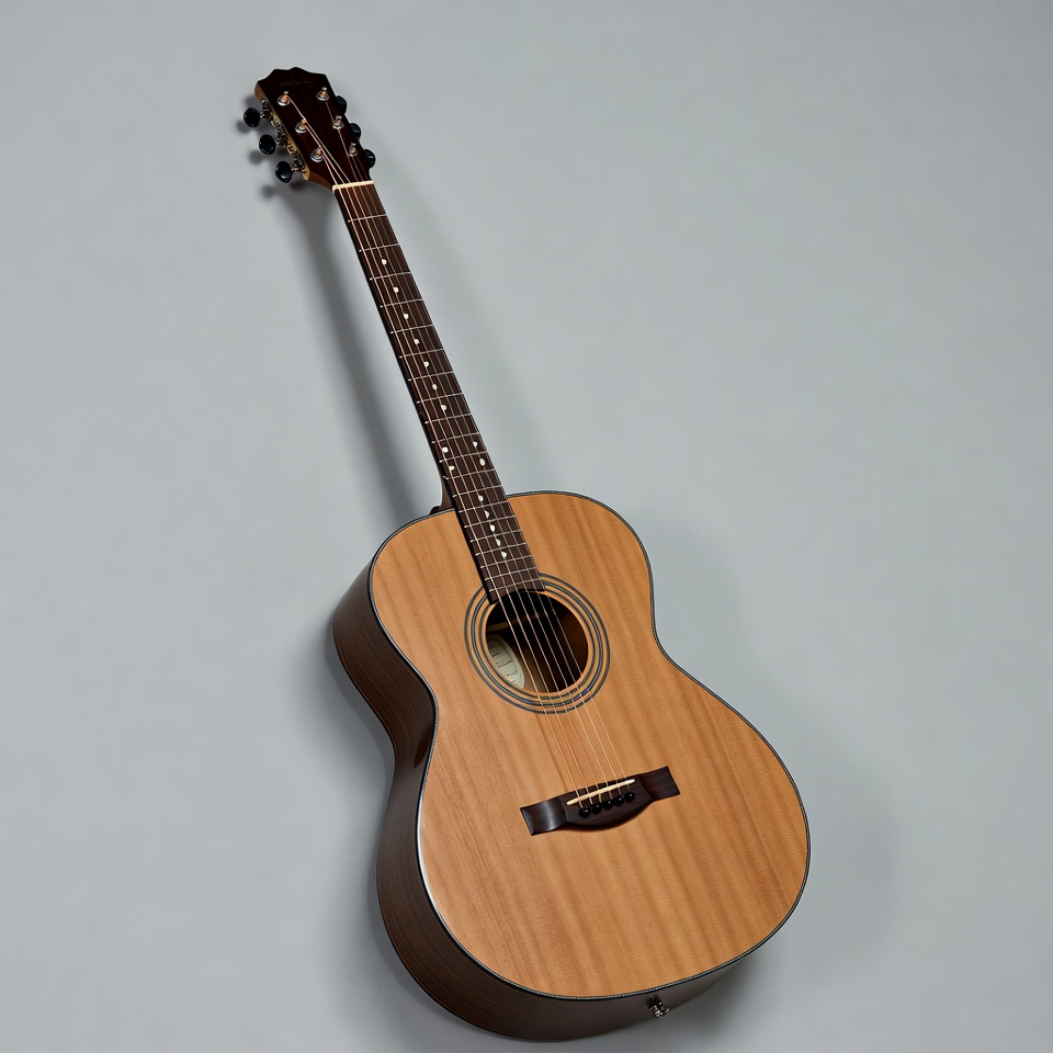 bridge, fretboard, glossy finish, guitar, headstock, isolated background, light brown wood, music instrument, sound hole, string instrument, strings, tuning pegs, white background, wooden guitar, acoustic guitar