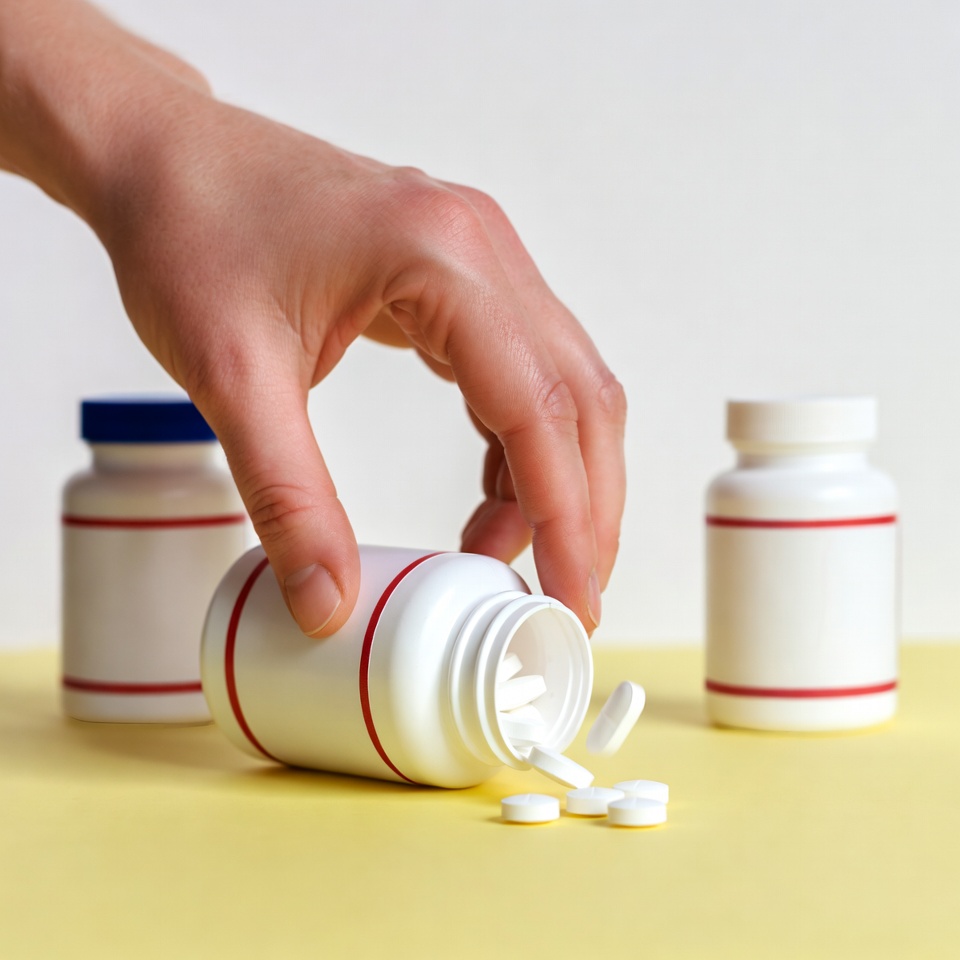 A hand holds an open white prescription bottle with a red cap, pouring white pills onto a yellow surface. Two additional closed pill bottles, one blue-capped and one white with red stripes, sit nearby on the yellow background. The hand is grasping the bottle firmly.