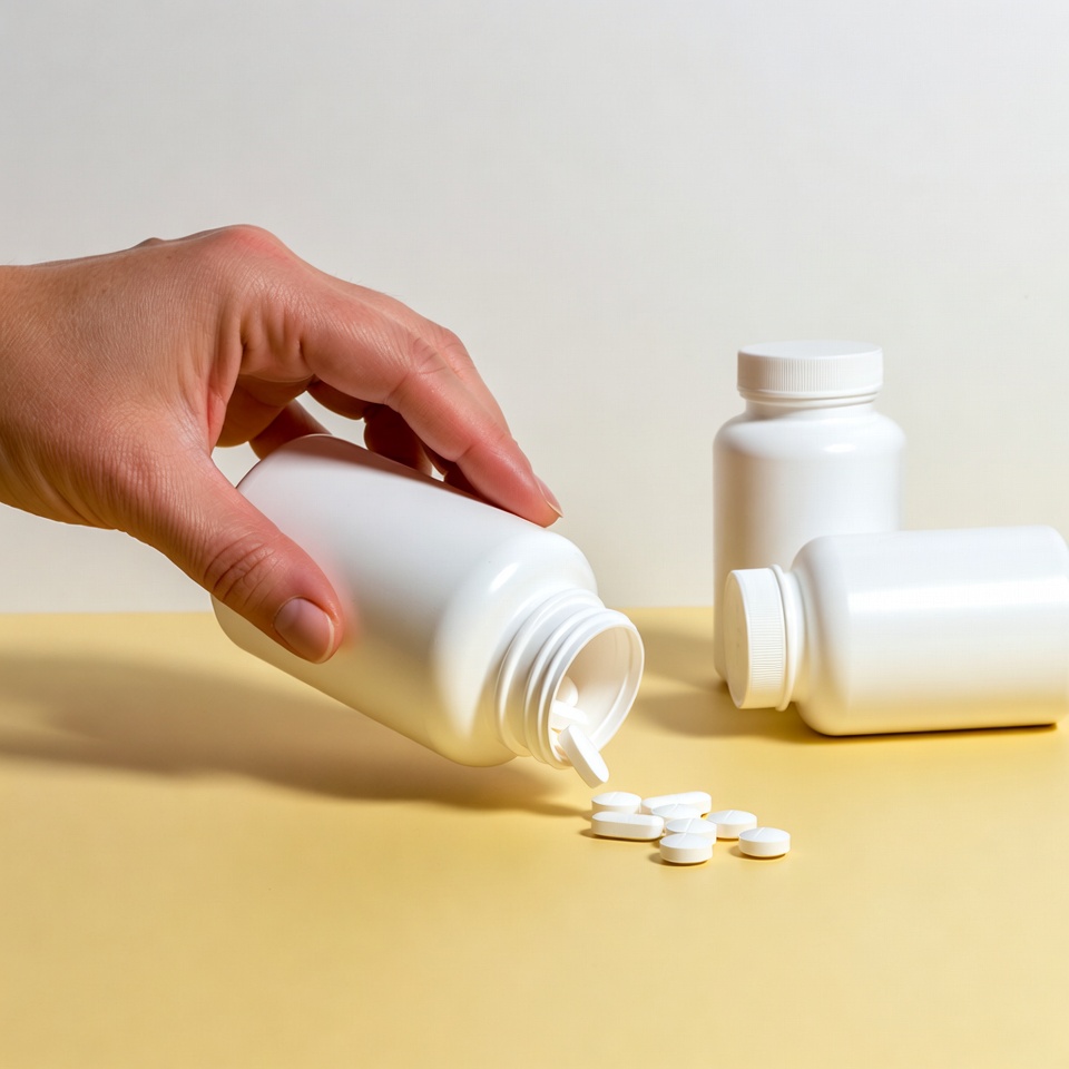 A hand tilts a white plastic pill bottle, pouring white round pills onto a yellow surface. Several spilled pills are scattered around the bottle. Additional white pill bottles stand nearby on the table.