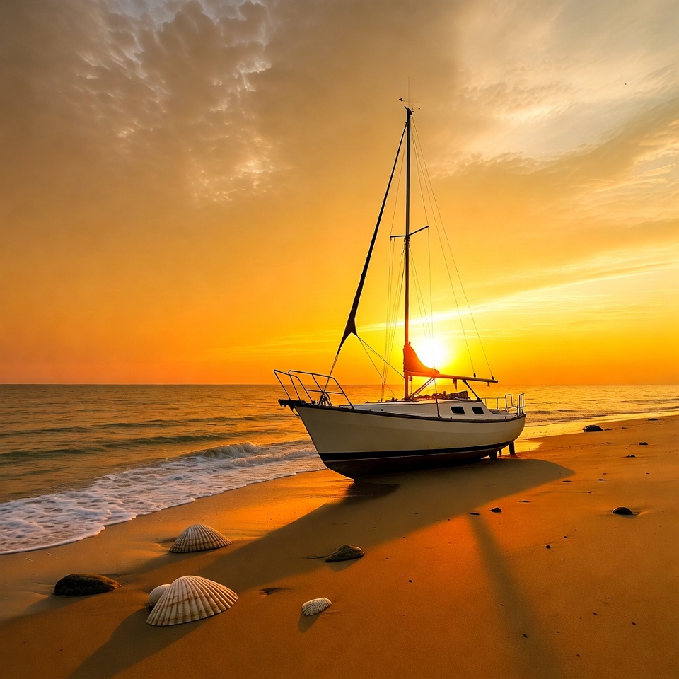 A white sailboat with its sails down rests on a sandy beach near gentle waves. The scene is bathed in warm orange hues from a vibrant sunset sky. Seashells are scattered on the golden sand around the boat.