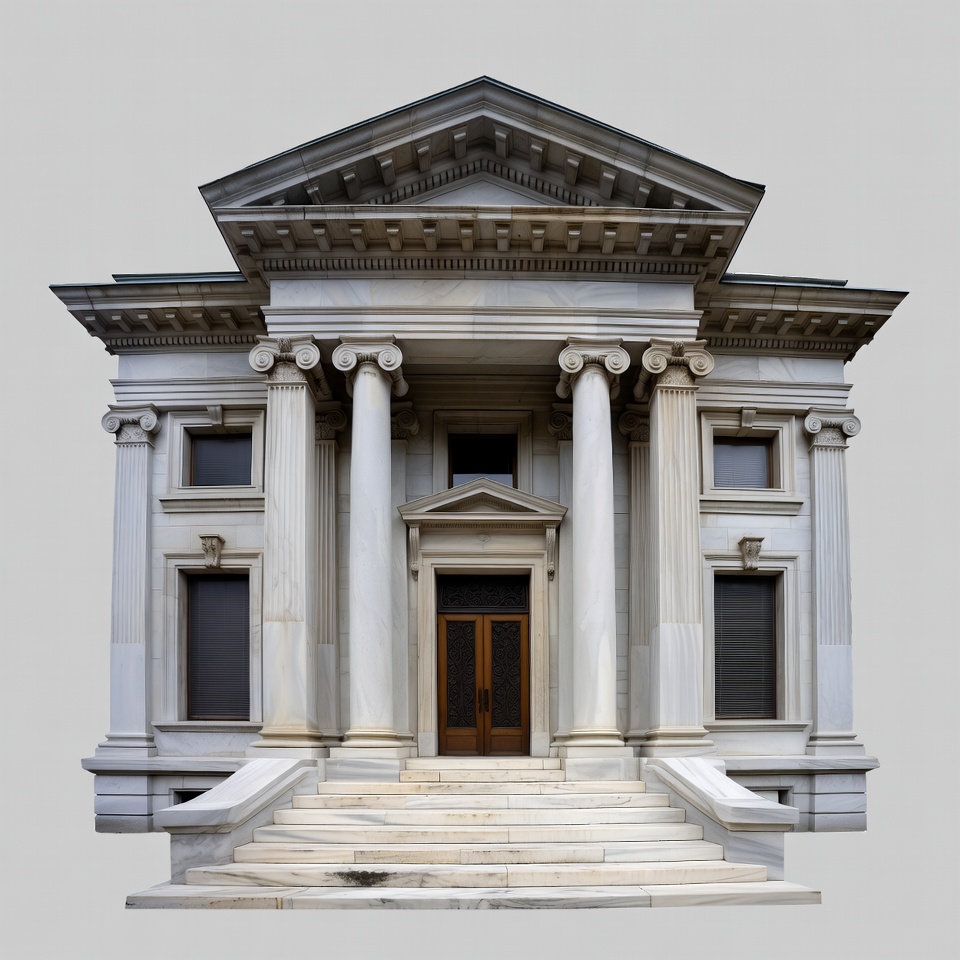 architecture, building, classical architecture, columns, entrance, facade, greek temple, historic building, isolated background, landmark, marble, monument, pediment, pillars, roman architecture, shutters, stairs, steps, structure, white stone, windows, wooden doors, neoclassical building