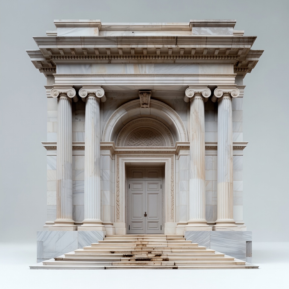 A white marble neoclassical temple stands isolated on a plain background. It features tall fluted columns supporting a pedimented entablature and an arched doorway with double doors. Wide steps lead up to the entrance.