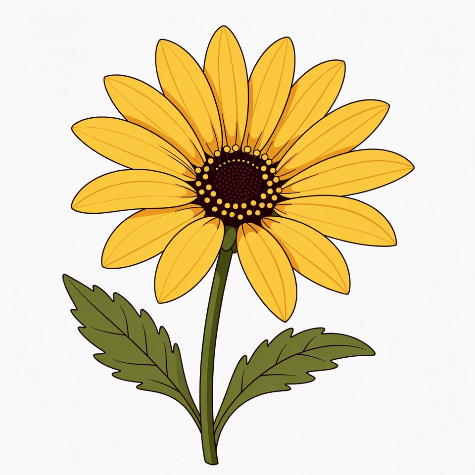 A vibrant yellow sunflower illustration features large petals surrounding a dark brown center. It stands on a green stem with serrated green leaves. The flower is depicted on a white isolated background.