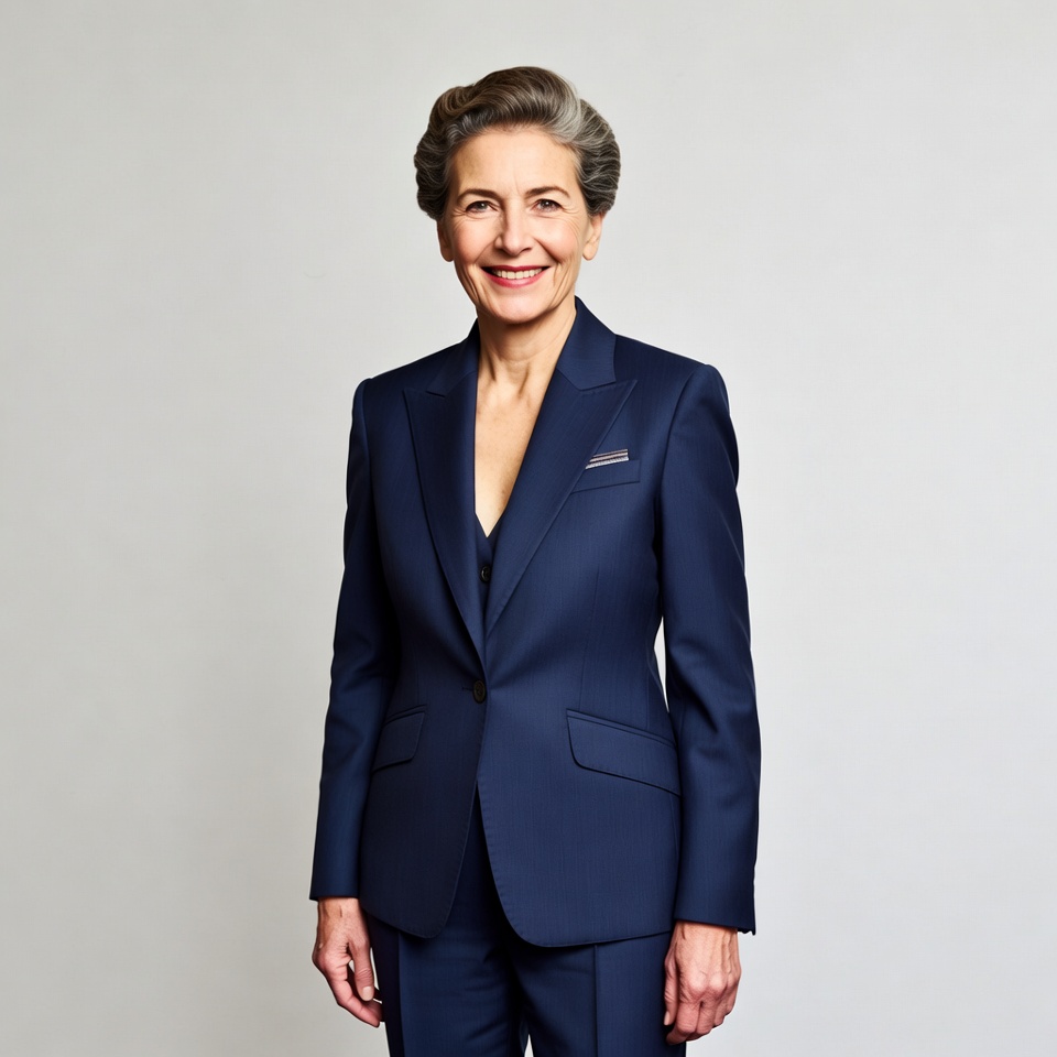 V-neck top, White, business suit, businesswoman, confident smile, elegant woman, female, formal wear, gray background, gray hair, headshot, lapel pin, mature woman, navy suit, portrait, professional attire, short hair, smiling, standing pose, woman