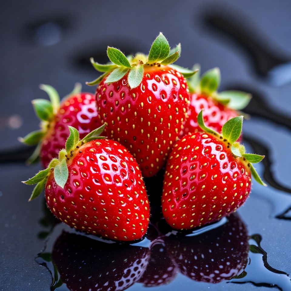 A cluster of five ripe red strawberries with green leaves sits on a glossy black surface. Water droplets glisten on the berries and the dark background. The strawberries are arranged closely together, showcasing their textured surfaces and vibrant color.