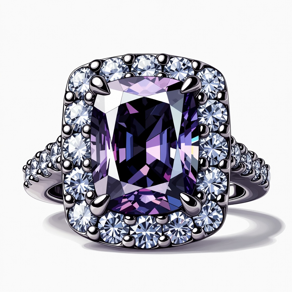 3D render, amethyst ring, black band, cocktail ring, diamond ring, emerald cut, engagement ring, fancy ring, fine jewelry, gemstone, isolated background, jewelry, luxury jewelry, purple gem, solitaire ring, sparkling diamonds, violet gem, white diamonds, women's ring, purple ring
