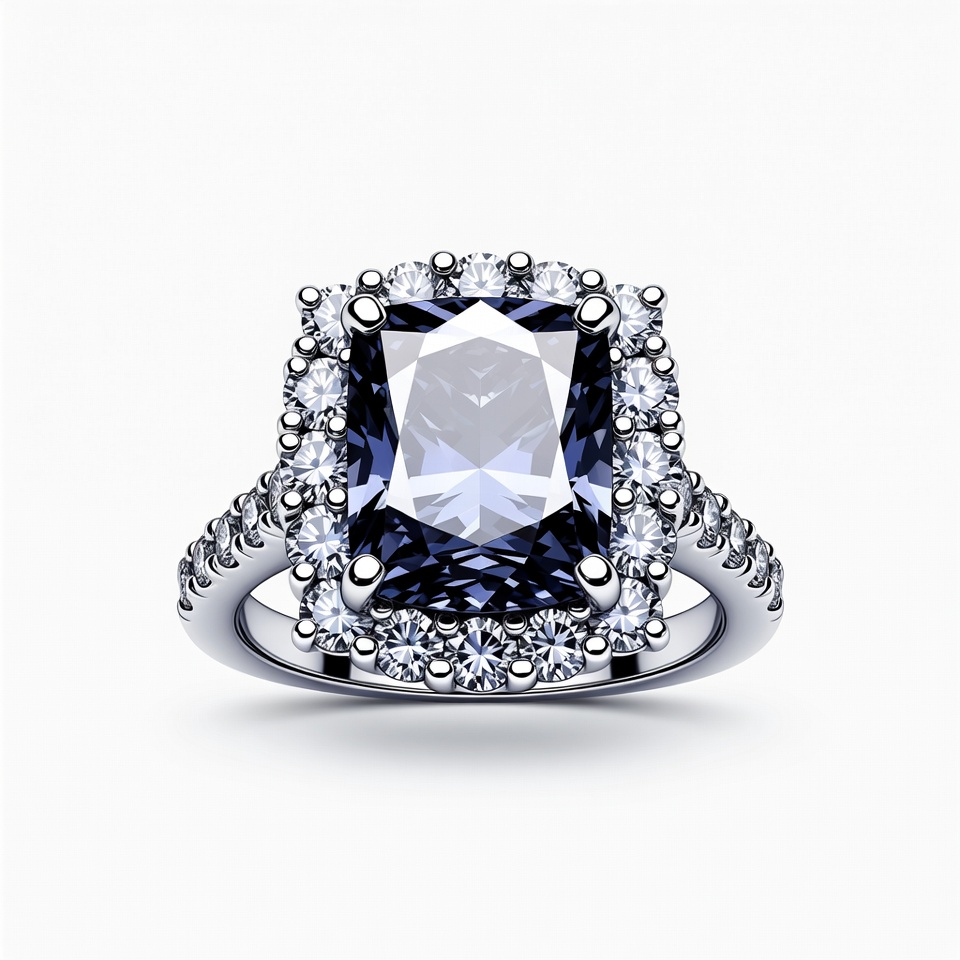 A stunning emerald-cut blue diamond ring features a large central stone surrounded by a sparkling diamond halo. The ring band is elegantly crafted in silver or white gold with additional diamond accents. It is displayed against a clean white background.