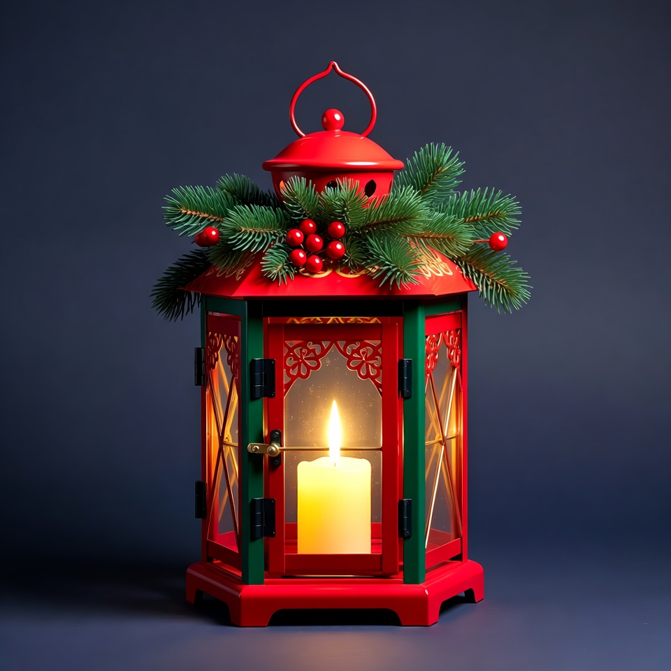 A red lantern with green and gold decorative panels holds a lit white candle inside. It is adorned with green fir branches and red berries on top. The lantern stands on a dark blue background, evoking a festive holiday atmosphere.