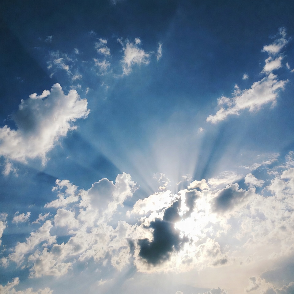 bright sun, clear sky, clouds, cloudscape, cumulus clouds, daytime sky, dramatic sky, fluffy clouds, golden rays, heaven, nature, sky, sky background, solar rays, sun rays, sunbeams, sunlight, weather, white clouds, blue sky