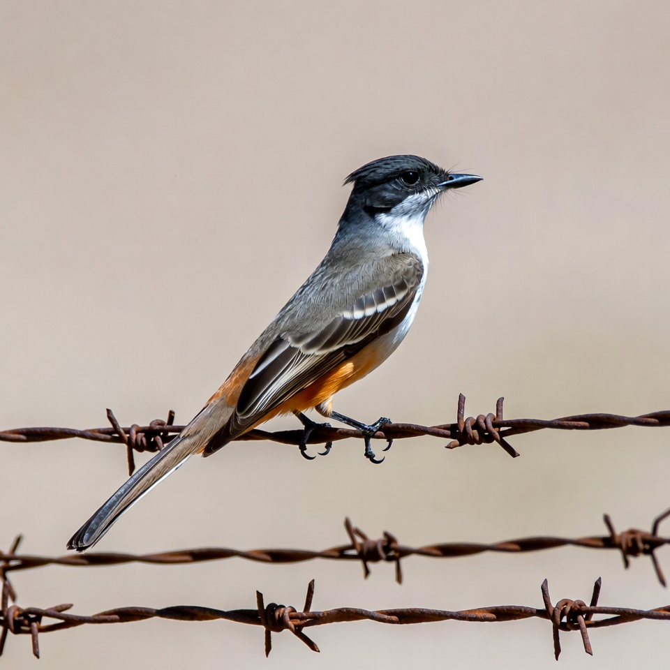 avian, barbed wire, bird, black head, feathers, fence, flycatcher, nature, orange wings, outdoor, perched, songbird, white breast, wildlife, Vermilion Flycatcher