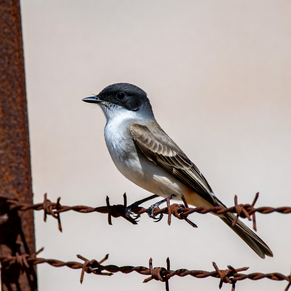 barbed wire, bird photography, birdwatching, black head, brown wings, feathers, flycatcher bird, long tail, nature, outdoors, perching bird, rusty fence, small bird, thin legs, white belly, wildlife, Vermilion Flycatcher