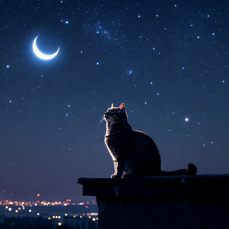 A tabby cat with striped fur sits on the edge of a rooftop at night, gazing at a crescent moon and starry sky. City lights twinkle in the distant background below. The scene features a dark blue night sky filled with stars and a glowing moon.