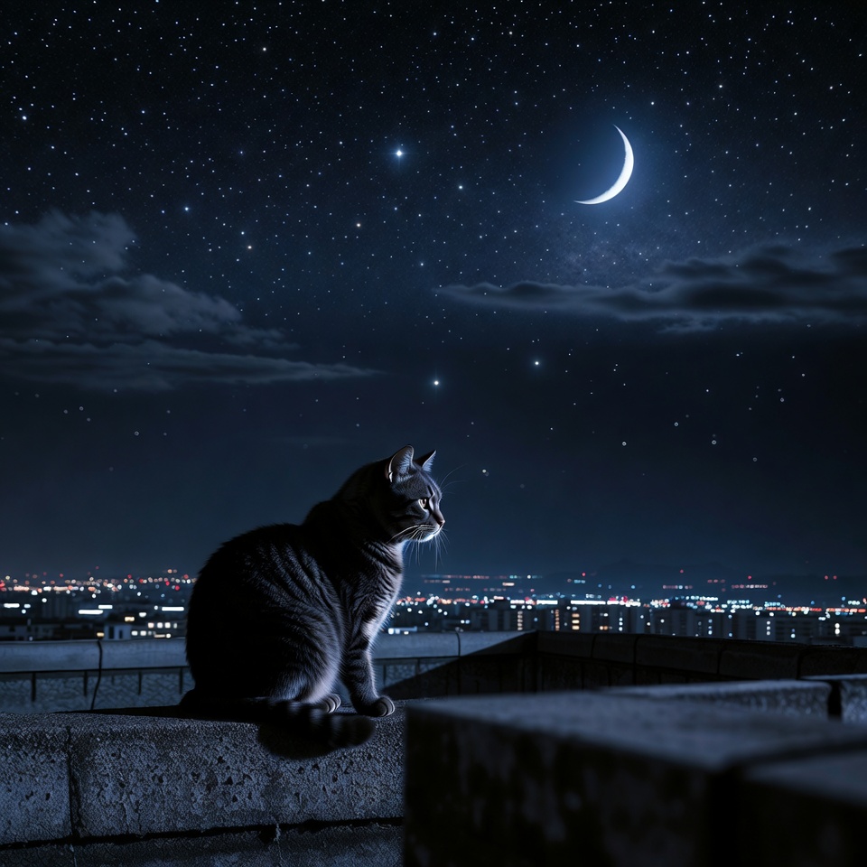 A gray tabby cat sits on the edge of a concrete rooftop gazing at a starry night sky with a crescent moon and scattered clouds. Below, a city skyline glows with numerous lights from buildings. The cat's fur is detailed with stripes, and it appears silhouetted against the dark urban horizon.