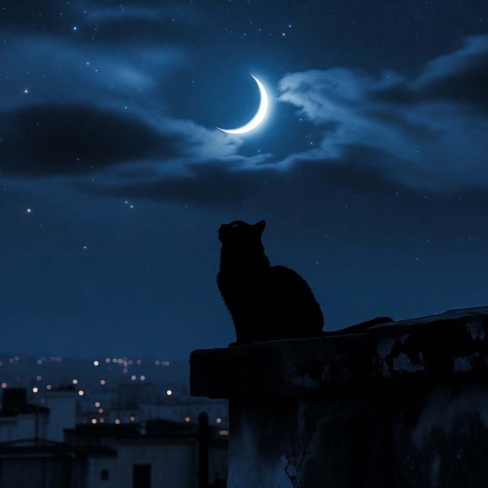 A black cat silhouette sits on an old rooftop ledge at night, gazing upward at a glowing crescent moon surrounded by stars and clouds. City lights twinkle in the background below the buildings. The scene features a dark, starry sky with the cat in sharp profile.