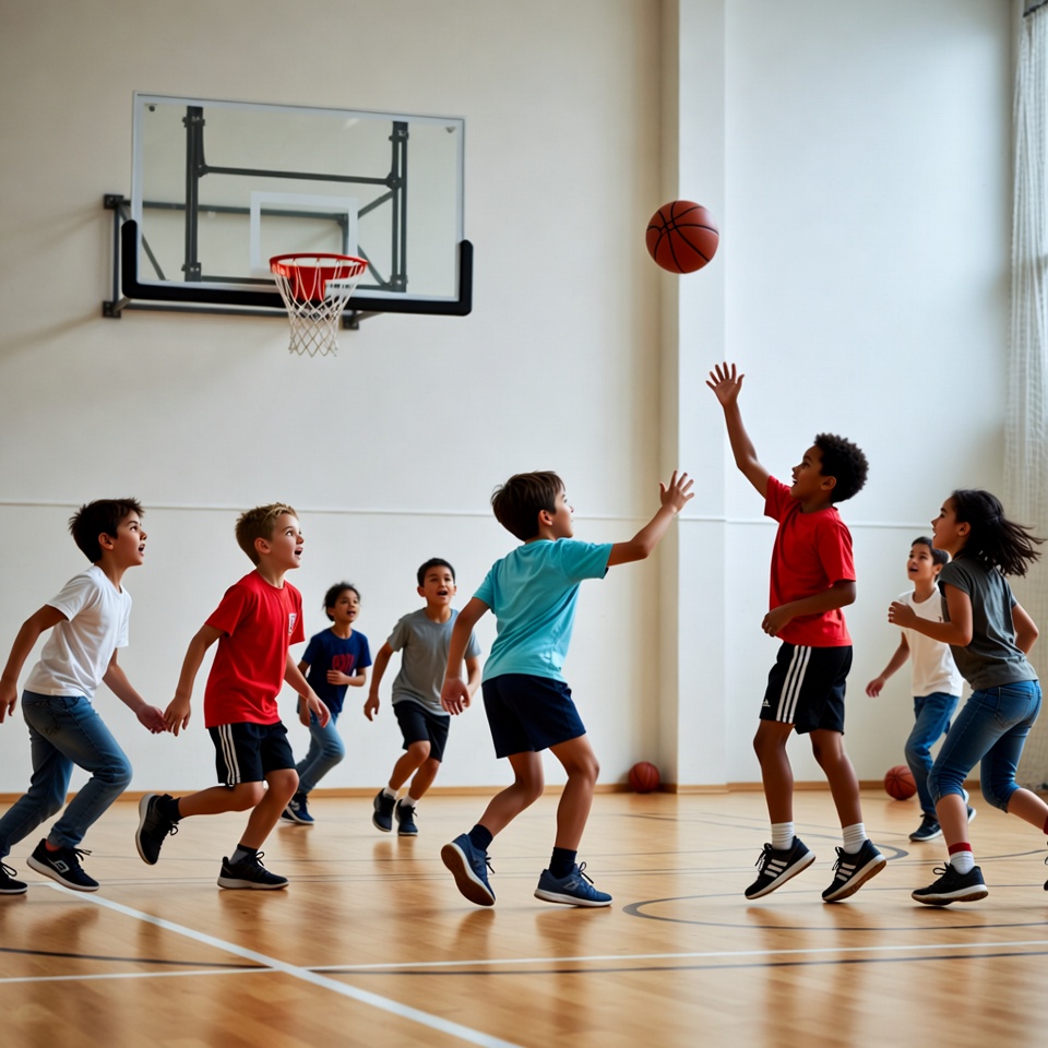 A group of diverse children plays basketball on an indoor gym court with a wooden floor. One boy in a red shirt jumps to catch a basketball near the hoop, while others in colorful shirts and shorts run around him. The scene features a basketball hoop mounted on a white wall with large windows nearby.