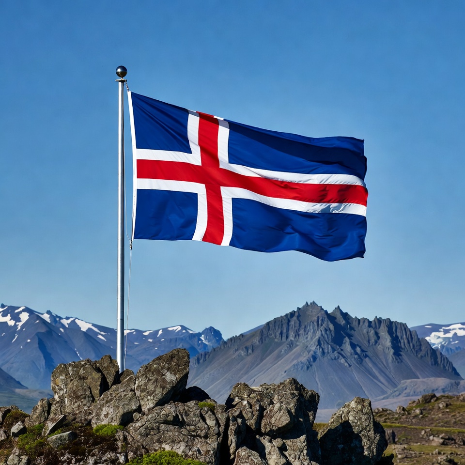 The Icelandic flag waves on a tall white flagpole against a clear blue sky. Snow-capped mountains rise in the background, with rocky terrain and green patches at the base. The flag features a white-bordered red cross on a blue field.