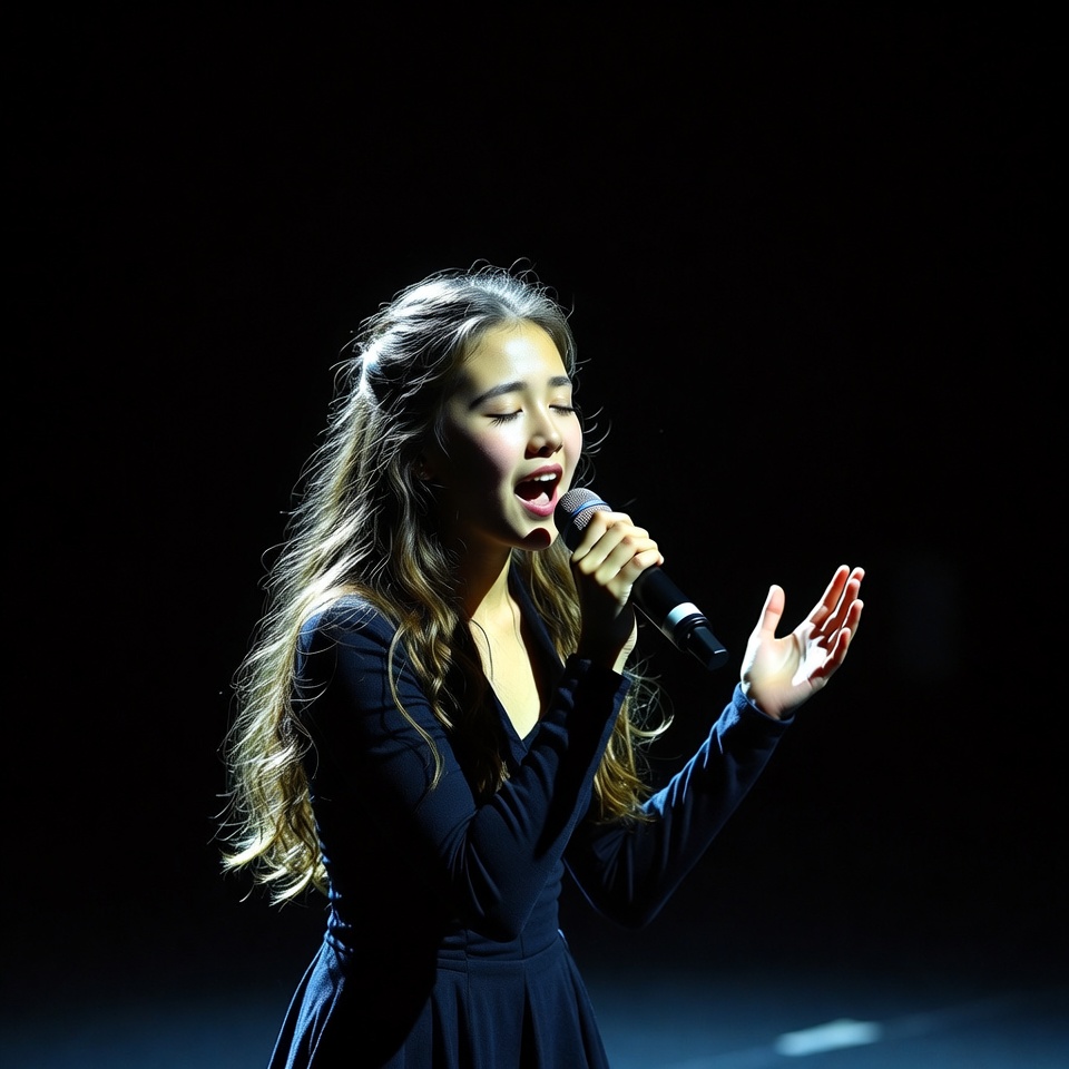 A young girl with long wavy brown hair sings passionately into a microphone on a dark stage. She wears a long-sleeved navy blue dress and holds the mic with one hand while raising the other expressively. Spotlights illuminate her face and upper body against the black background.