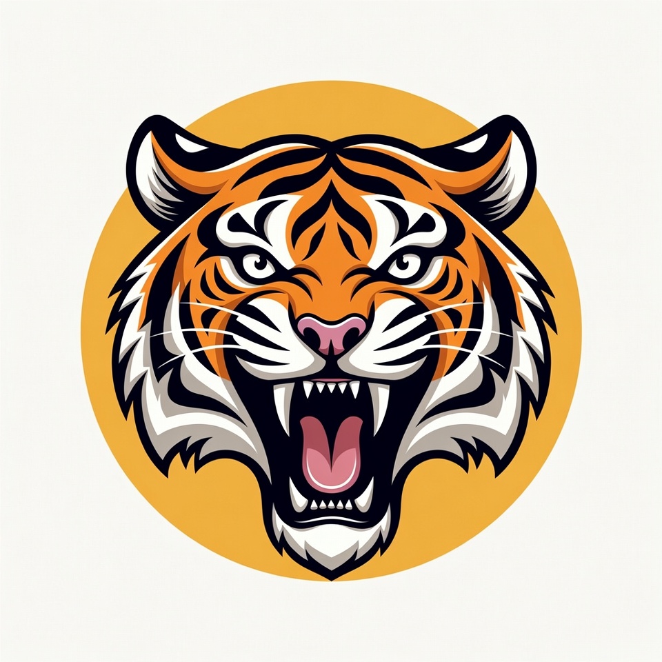 animal, big cat, black stripes, clipart, fierce tiger, illustration, isolated background, logo, mascot, orange tiger, predatory cat, roaring tiger, sharp teeth, snarling tiger, tiger face, tiger head, vector art, wild animal, yellow circle, tiger