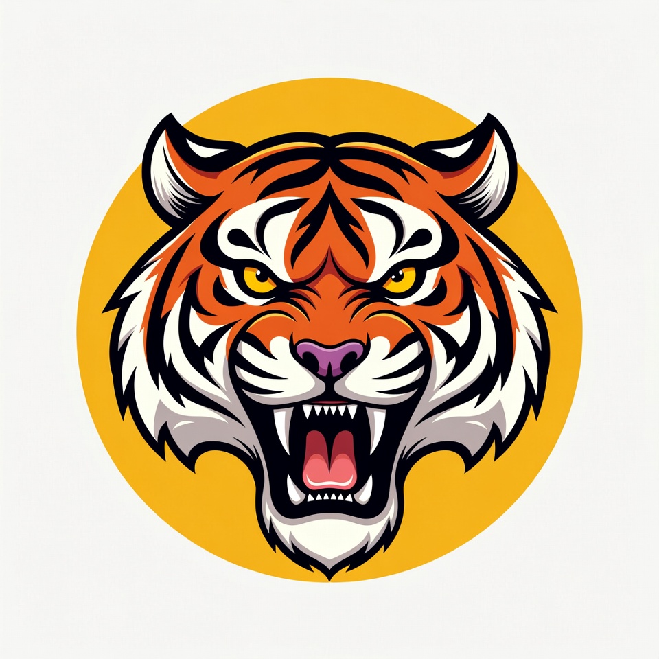 animal, big cat, black stripes, circular background, clipart, fierce tiger, illustration, isolated background, orange tiger, roaring tiger, sharp teeth, snarling tiger, tiger face, tiger head, tiger illustration, vector art, wild animal, yellow background, yellow eyes, tiger