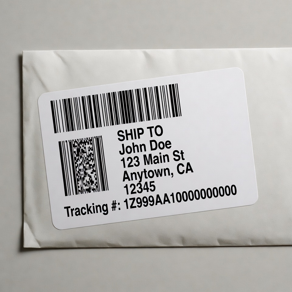 A white envelope features a shipping label addressed to John Doe at 123 Main St, Anytown, CA. The label includes a barcode, QR code, and tracking number 1299A1000000000. The envelope is viewed from the front on a plain background.