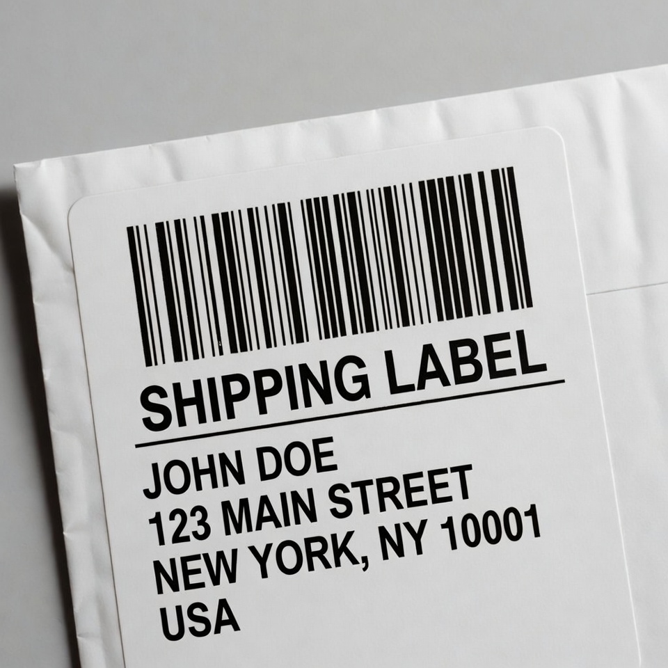 A white envelope features a large shipping label with black text and barcode. The label reads 'John Doe, 123 Main Street, New York, NY 10001, USA'. It is angled against a plain gray background.