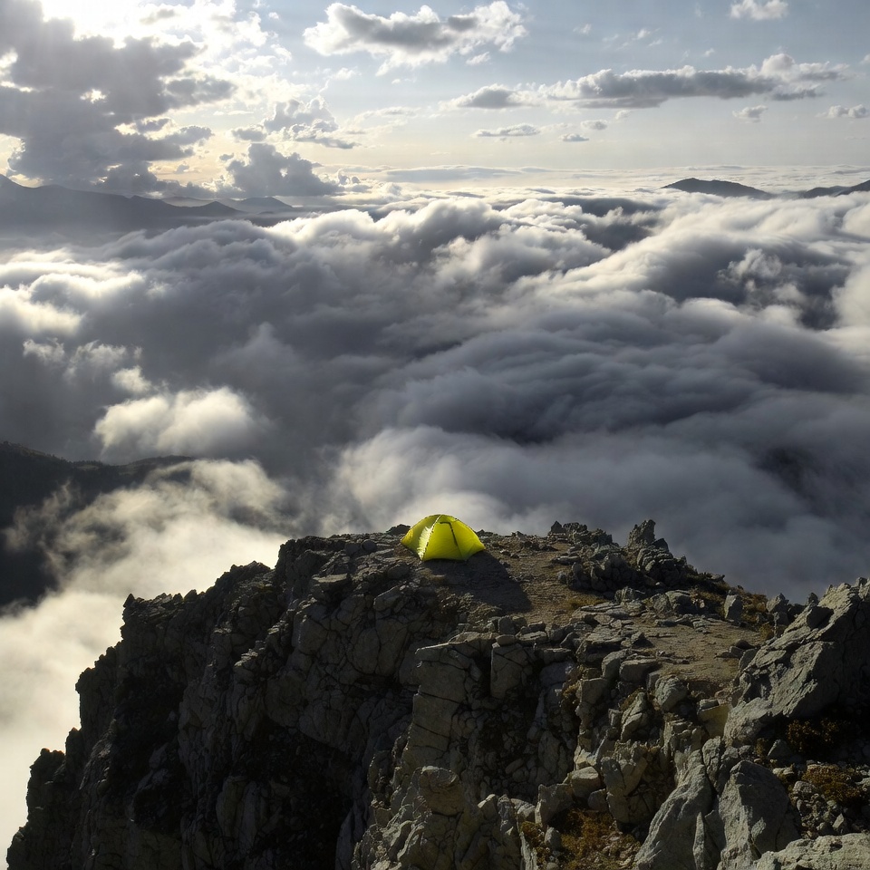 adventure, backpacking, camping, clouds, cloudy valley, dramatic sky, fog, high altitude, hiking, landscape, mountain, mountaintop, nature, outdoors, peak, rocky cliff, scenic view, summit, sunrise, sunset, wilderness, yellow tent, tent