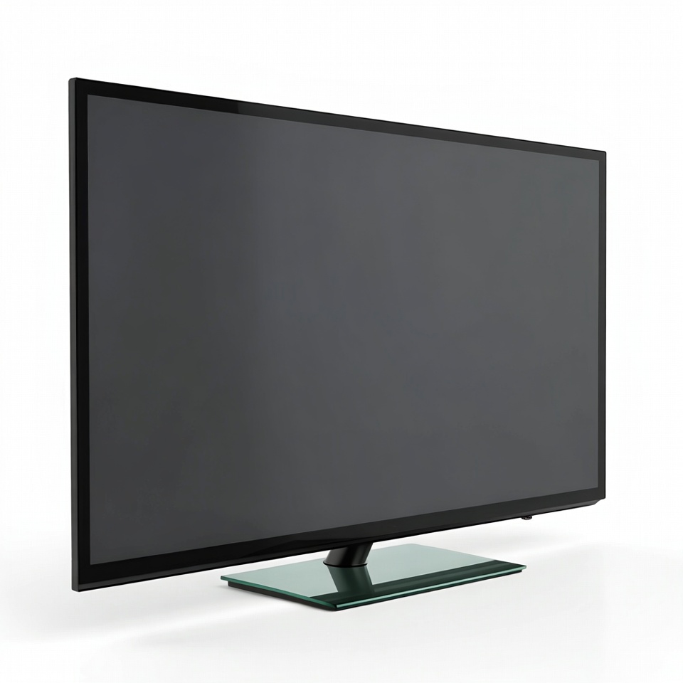 LED TV, black TV, digital display, display, electronics, flat screen, glass stand, home entertainment, isolated background, modern TV, monitor, side view, television, white background, TV