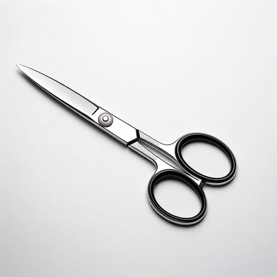 black handles, craft scissors, cutting tool, ergonomic handles, isolated background, metal scissors, pivot screw, pointed scissors, sharp blades, silver scissors, tailoring scissors, white background, scissors