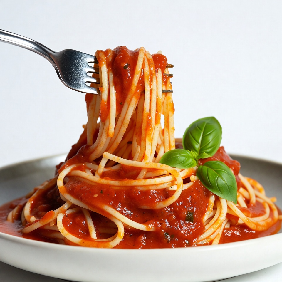 A fork lifts a portion of spaghetti coated in thick red marinara sauce, garnished with fresh basil leaves. The pasta is served on a dark plate against a white background. Strands of spaghetti dangle from the silver fork.