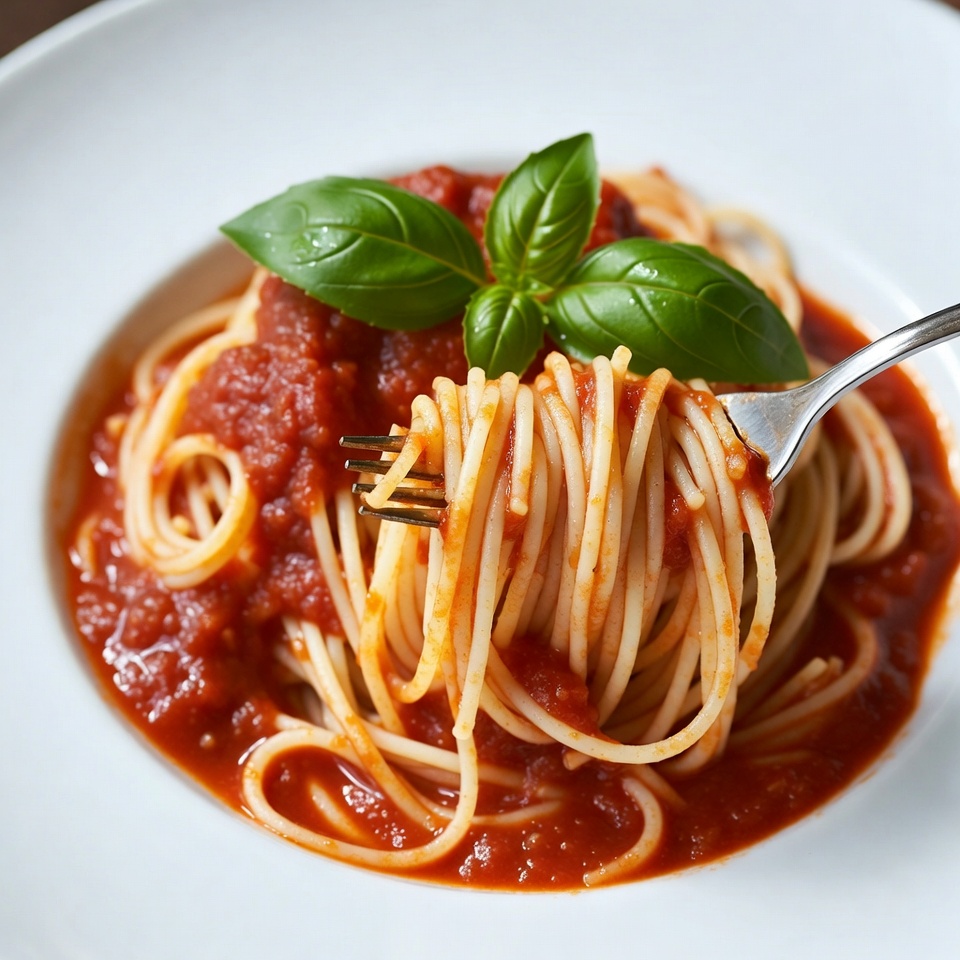 A white bowl holds a serving of spaghetti pasta coated in thick red marinara sauce. Fresh green basil leaves garnish the top. A silver fork lifts a portion of the twirled noodles from the dish.