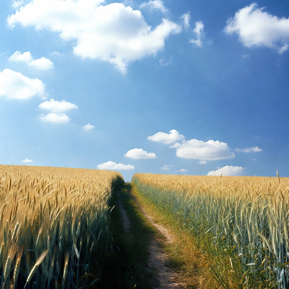 agriculture, blue sky, clouds, crops, dirt path, farmland, field path, golden wheat, grain field, green wheat, harvest, horizon, landscape, nature, outdoors, path, rural, scenery, sky, summer, sunny day, trail, white clouds, yellow wheat, wheat field