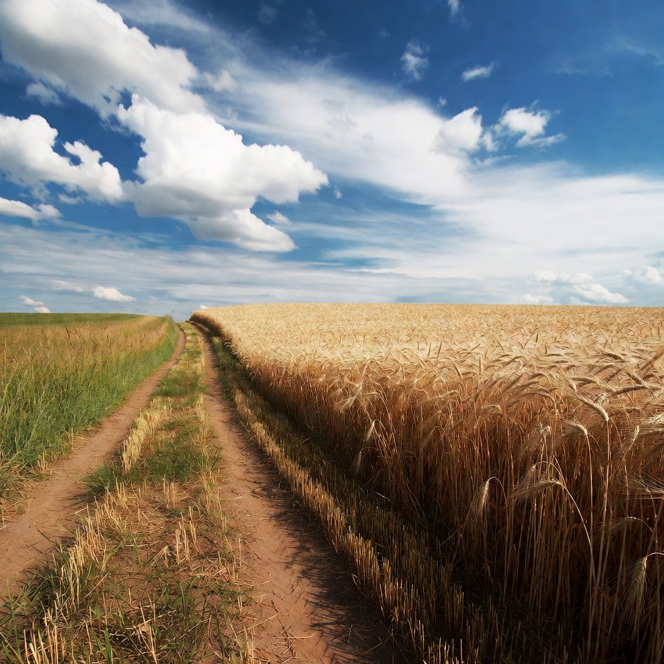 agriculture, blue sky, clouds, countryside, dirt path, farmland, field path, fields, golden wheat, grassy field, green grass, harvest, landscape, nature, outdoor, pathway, rural road, rural scene, scenic, sky, summer landscape, sunny day, wheat crop, white clouds, wheat field