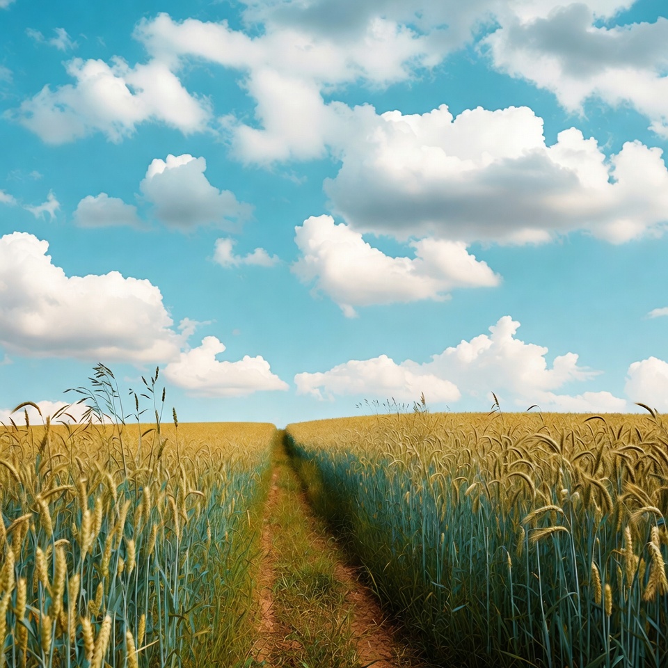 agriculture, blue sky, cereal crop, clouds, countryside, dirt path, field path, fluffy clouds, golden wheat, grain field, harvest field, nature, outdoors, pathway, rural landscape, sky, summer sky, vibrant sky, white clouds, wheat field