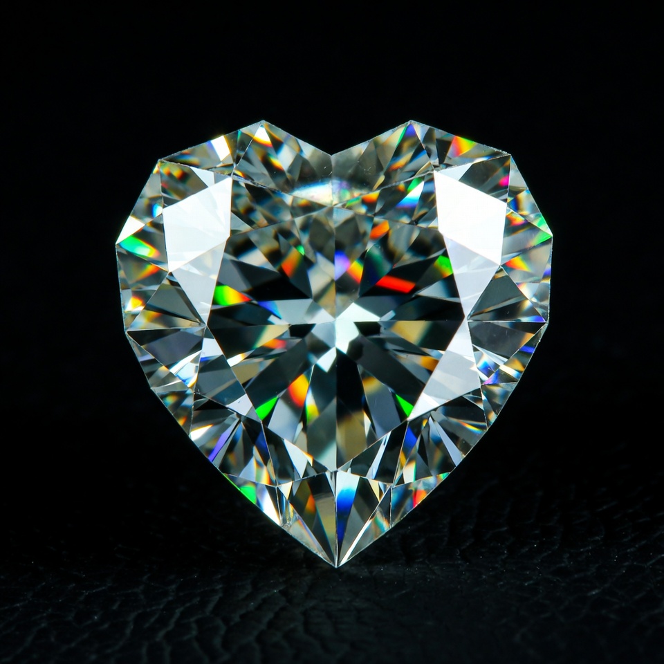 A sparkling heart-shaped diamond gemstone sits on a black leather surface. The diamond features intricate facets that refract colorful light, creating rainbow prisms. It is centered against a dark, isolated background.
