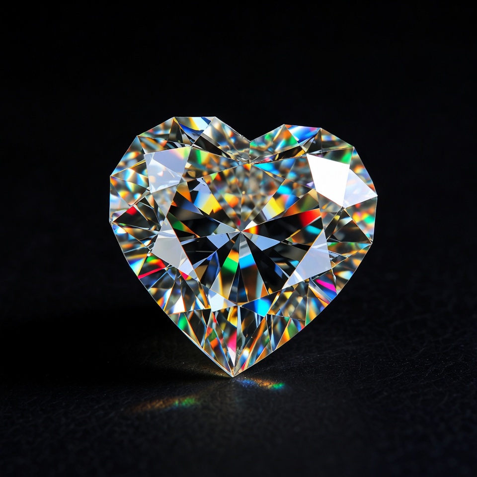 A large, faceted diamond cut into a heart shape gleams with rainbow refractions against a solid black background. The gem's intricate facets capture and disperse light in vibrant colors. It is centered and isolated for dramatic effect.