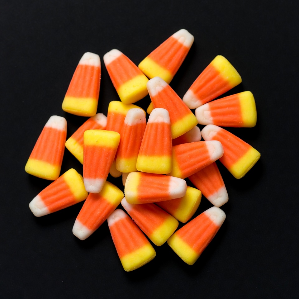 autumn candy, black background, candy pile, confectionery, corn candy, festive candy, halloween candy, holiday treat, isolated, orange candy, pile, scattered, sweet treat, white candy, yellow candy, candy corn